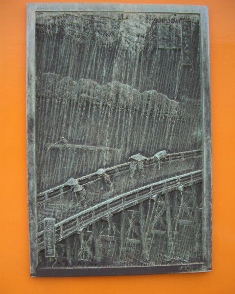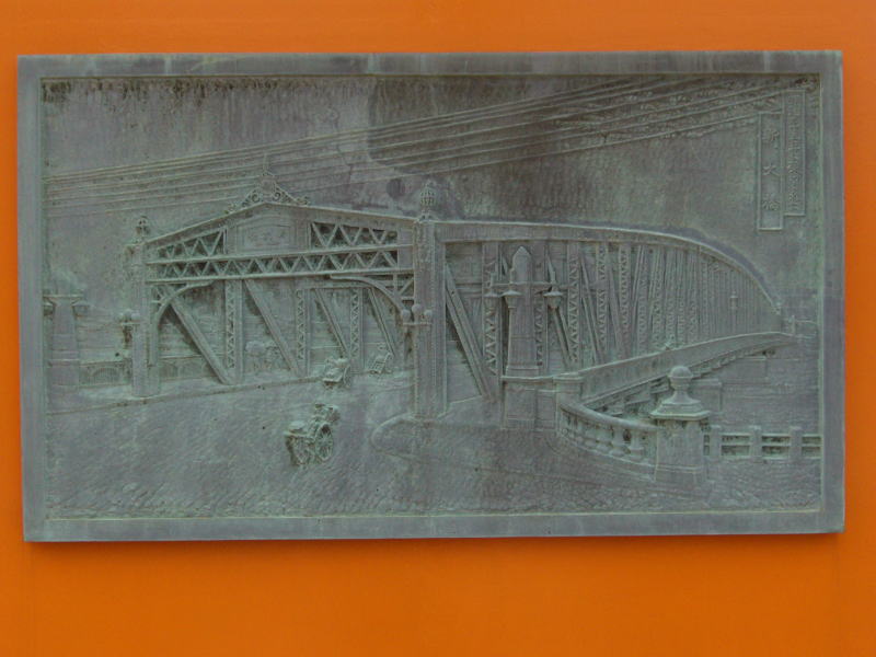 主塔の袂には、新大橋に因んだレリーフが掲げられている。