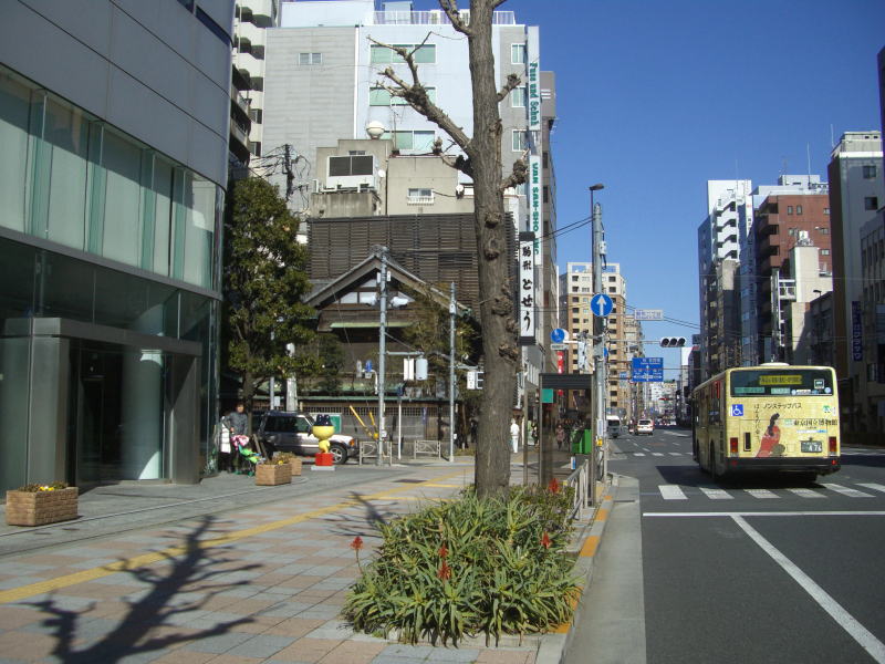 信号向こうに見える木造建家は老舗どじょう料理店『駒形どぜう』。