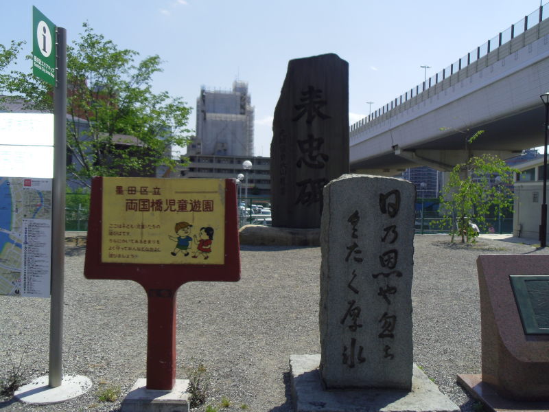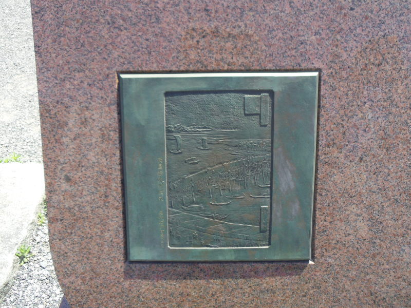 大高源吾の句の石碑の隣には江戸期の両国橋の様子が描かれた石碑