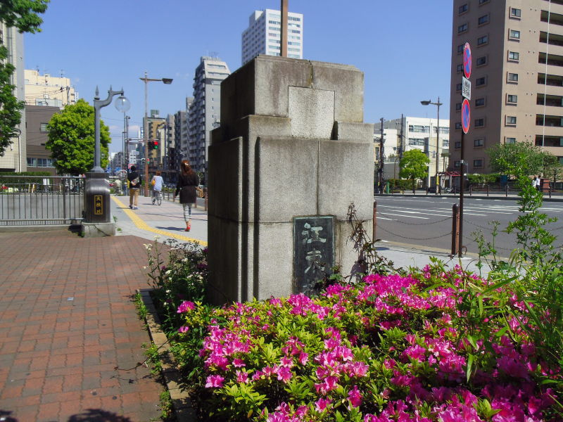 旧江東橋の親柱には橋の沿革が掲げられている。