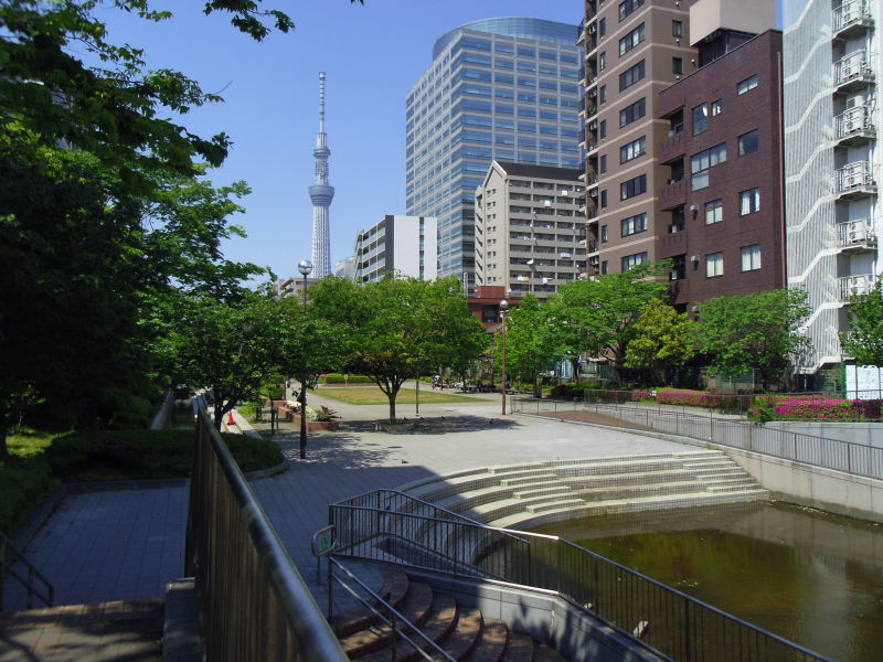 その被害を食い止める為に、堅川分岐~北十間側分岐の流路の大半を埋め立て、1.8kmに及ぶ細長い公園として生まれ変わらせた。