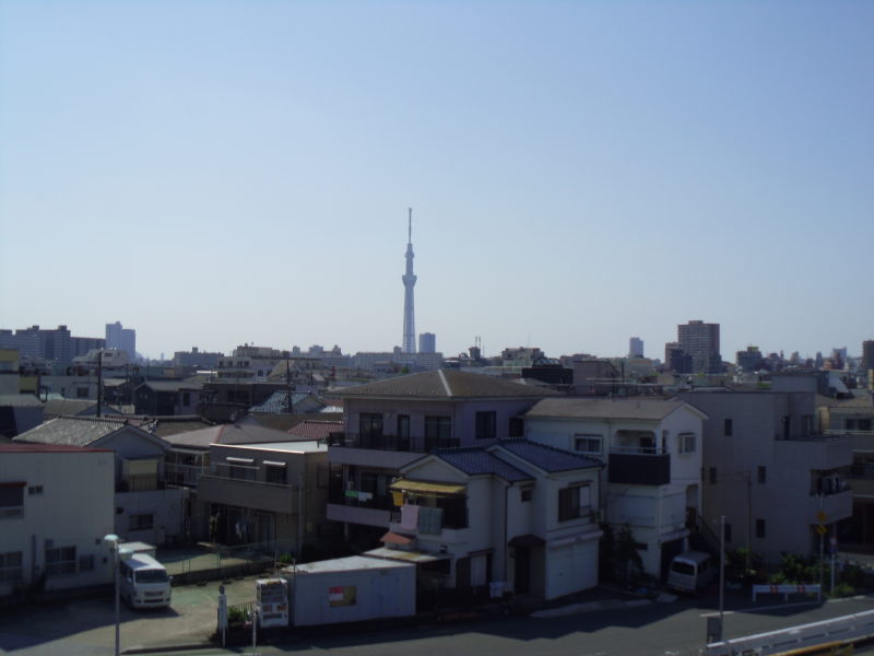 振り返ると下町の住宅地向こうに高々と聳えるスカイツリー。