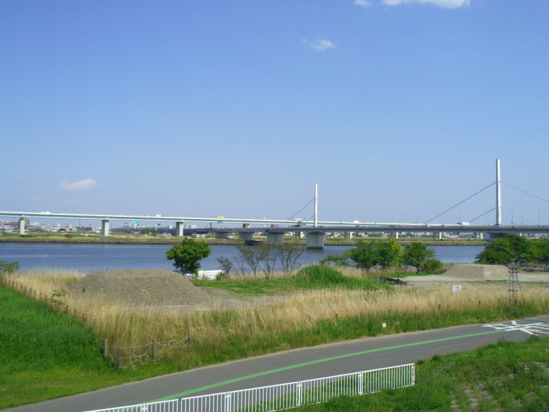 荒川大橋先で荒川と中川を隔てる土手上を通る首都高中央環状線と交差。