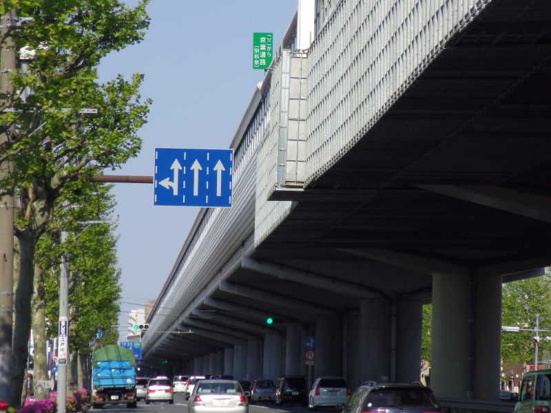 交差点を過ぎてすぐの所で上の首都高を仰ぎ見ると、緑色の標識が掲げられているのが気付く。