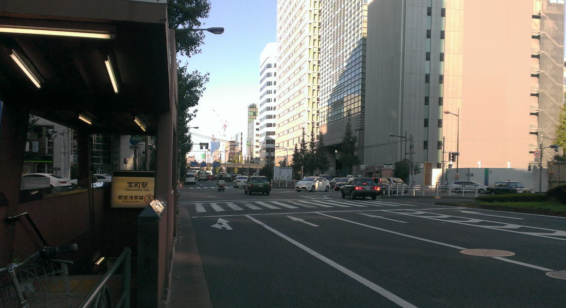 歩道の脇に都営浅草線の宝町入口。